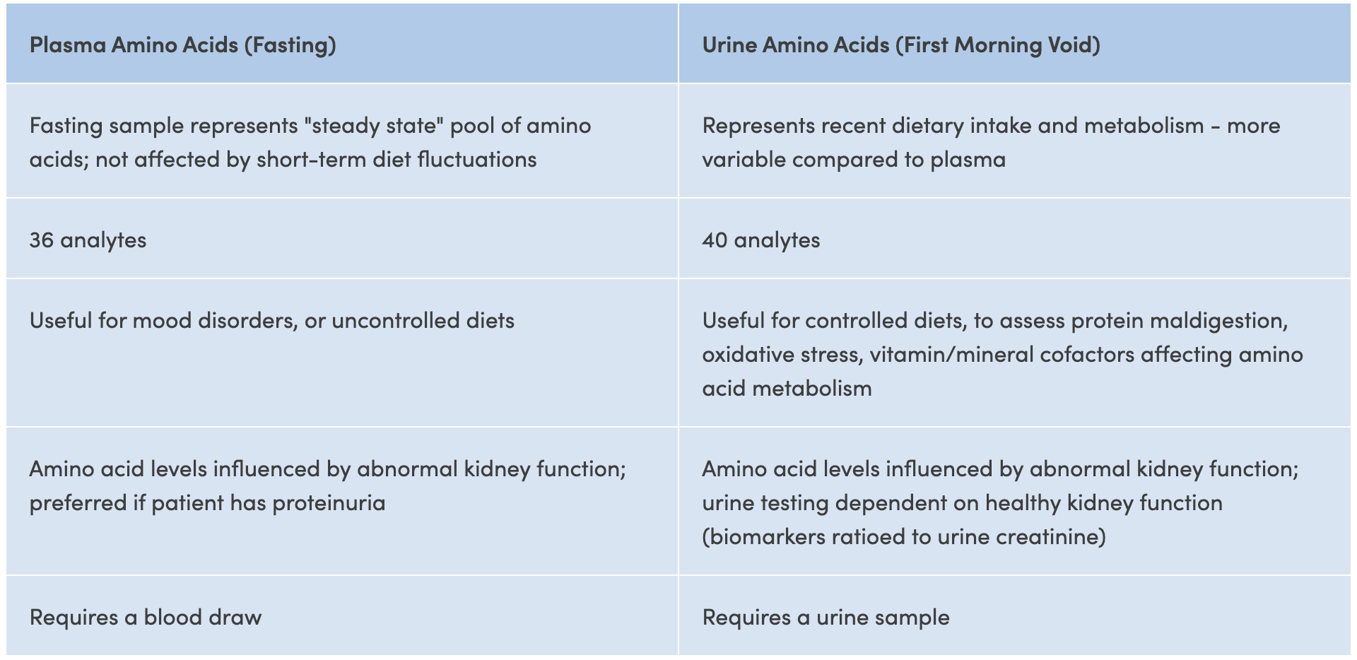 Certain amino acids are measurable in blood versus urine and sample type selection depends on the clinical concern. The key differences between plasma and urine amino acids are summarized below.